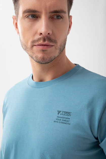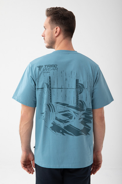Męski T-shirt oversize w kolorze błękitnym. T-shirt ma krój oversize dający dużą swobodę ruchu, dzięki czemu jest idealny na co dzień. Wyrazisty nadruk ławeczki treningowej na plecach oraz minimalistyczny logotyp na piersi.