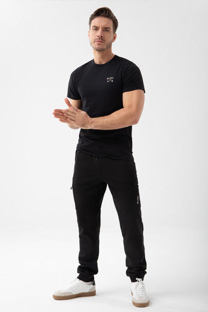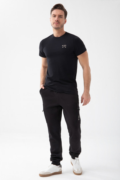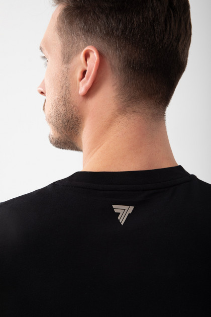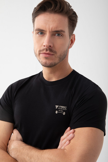 T-shirt męski slim fit w kolorze czarnym. Koszulka uszyta jest w 95% z bawełny i w 5% z elastanu, dzięki czemu jest idealna na co dzień. Krój slim fit doskonale podkreśla sylwetkę. Z przodu wypukły nadruk logotypu TREC Wear. Gramatura 180 gsm – trwała i komfortowa, elastyczna dzianina singiel jersey wysokiej jakości.