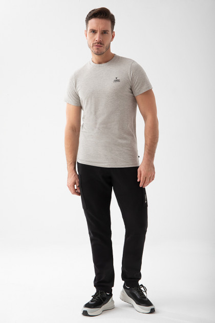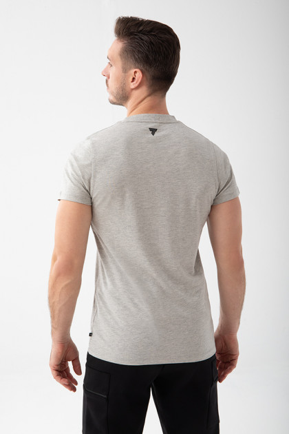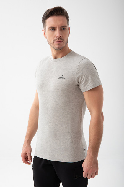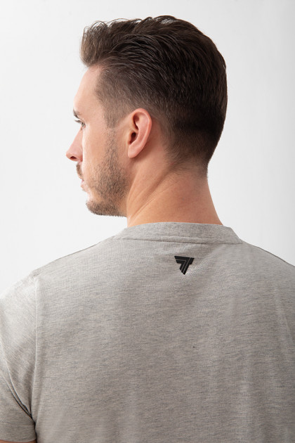 T-shirt męski slim fit w kolorze melanżowym szarym. Koszulka uszyta jest w 95% z bawełny i w 5% z elastanu, dzięki czemu jest idealna na co dzień. Krój slim fit doskonale podkreśla sylwetkę. Z przodu wypukły nadruk logotypu TREC Wear. Gramatura 180 gsm – trwała i komfortowa, elastyczna dzianina singiel jersey wysokiej jakości.