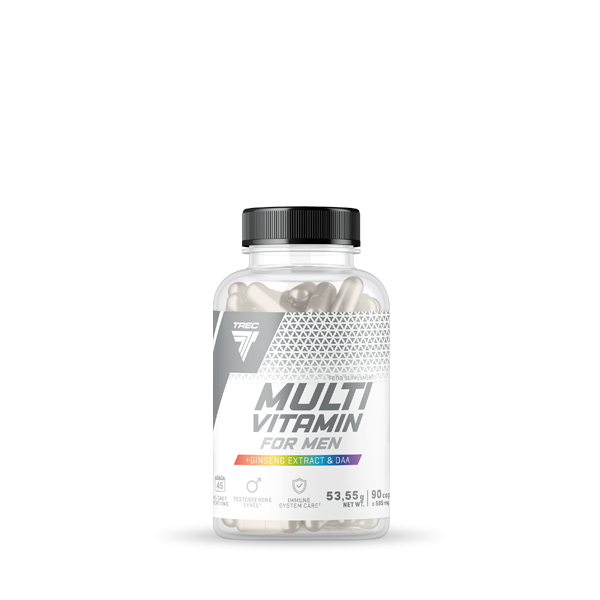 TREC MULTIVITAMIN FOR MEN. Suplement diety. Produkt w postaci kapsułek zawierający kompleks witamin dla mężczyzn, który został dodatkowo wzbogacony o L-argininę, ekstrakt z żeń-szenia koreańskiego, DAA, taurynę, magnez i cynk.